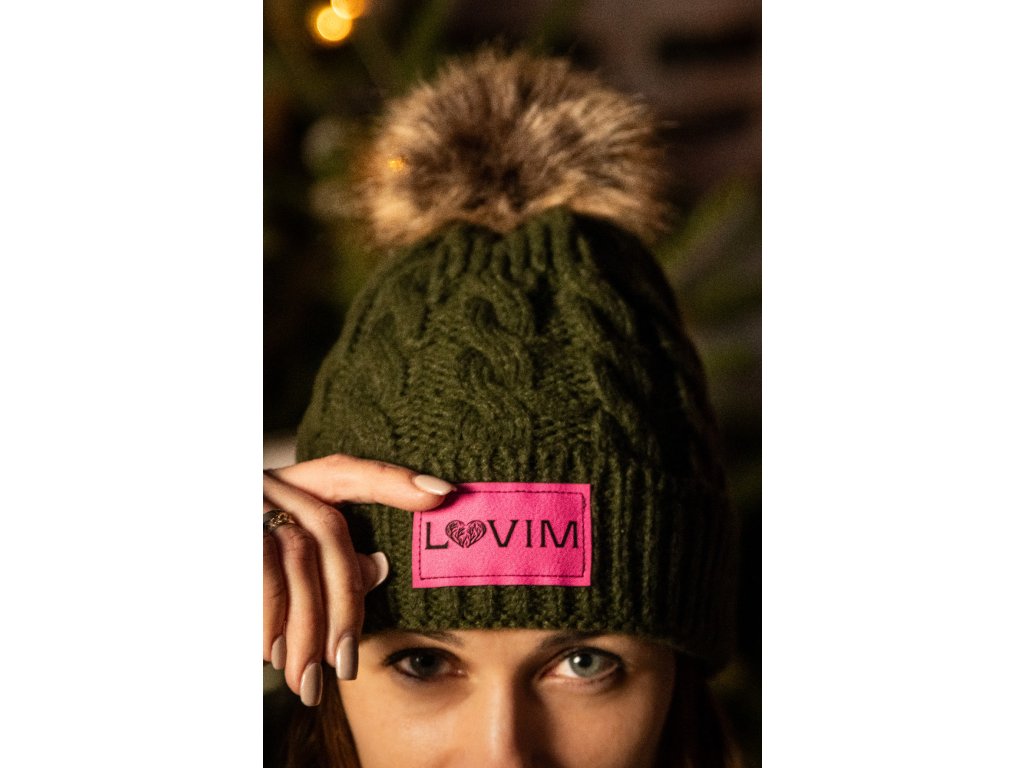 Dámska pletená čiapka s ružovou koženkovou nášivkou Lovim a bombrlcom