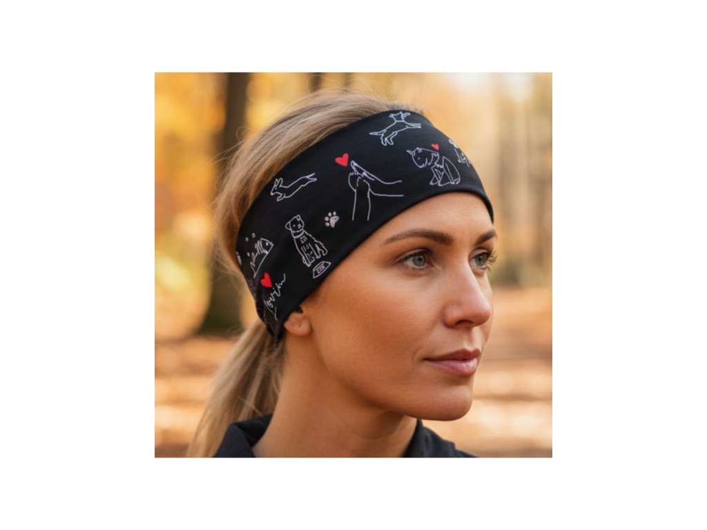 Funkčná čelenka s autorským dizajnom psíkov. Čelenky sú ručne šité v našej dielni na Slovensku. Zloženie je 78% polyester, 22% spandex.