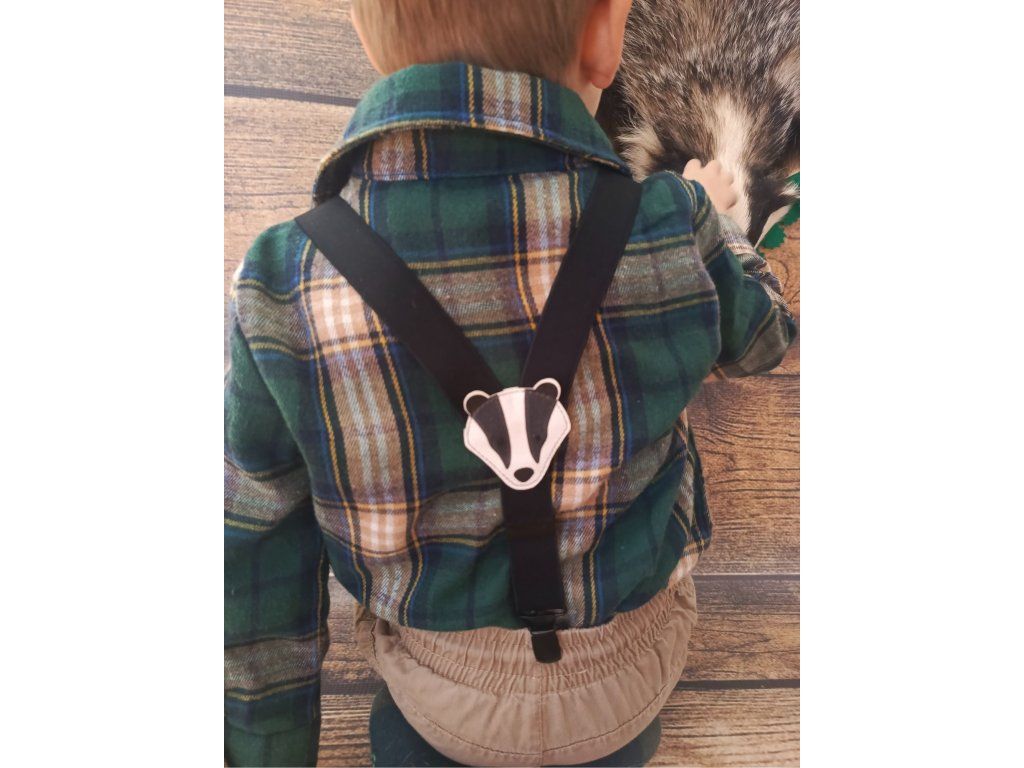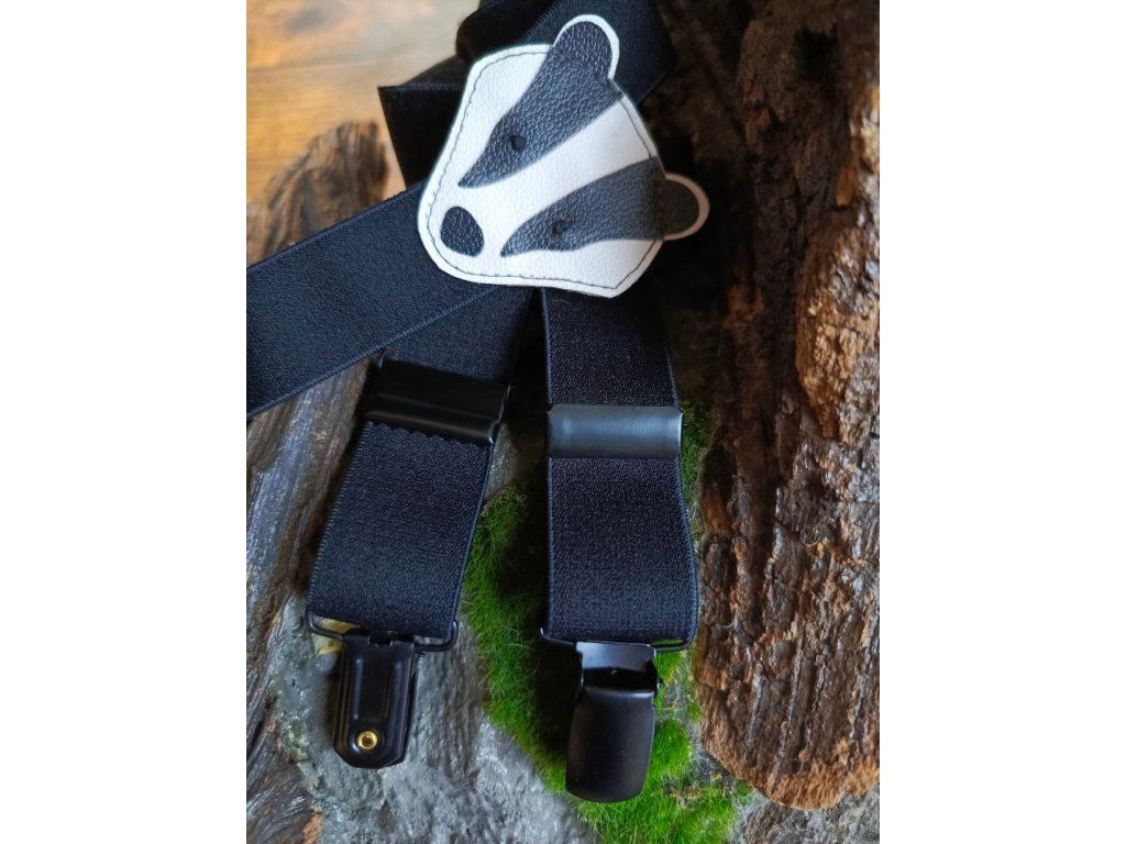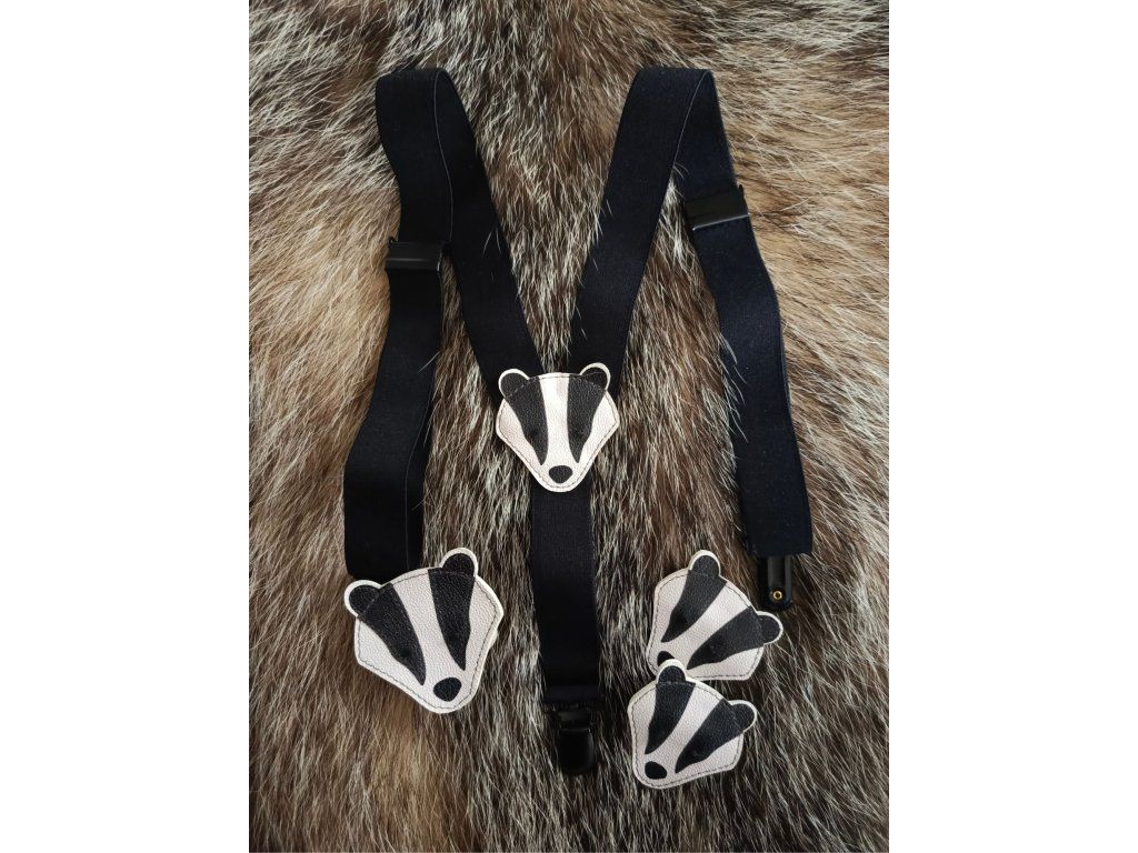 Traky: majú nastaviteľné gumy čiernej farby v kombinácii s čiernymi klipmi a hlavou jazveca. Minimálna dĺžka trakov je 38cm a maximálna 65cm.