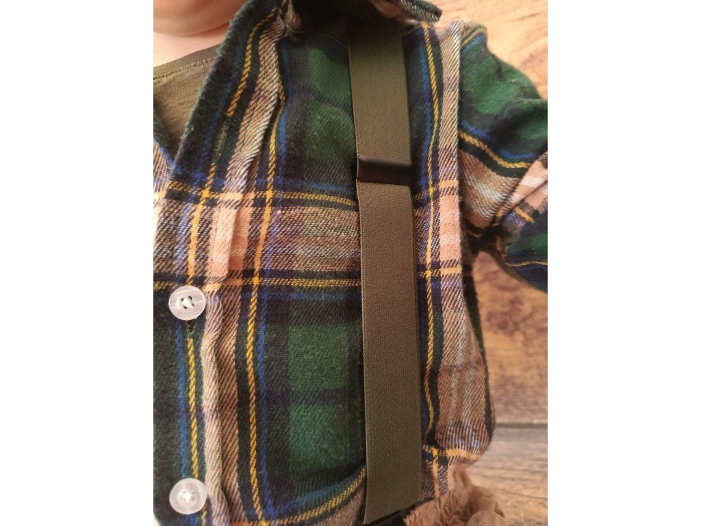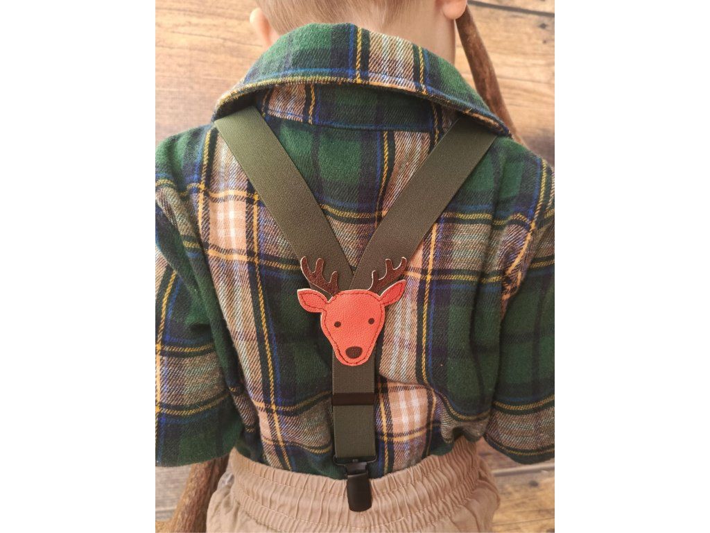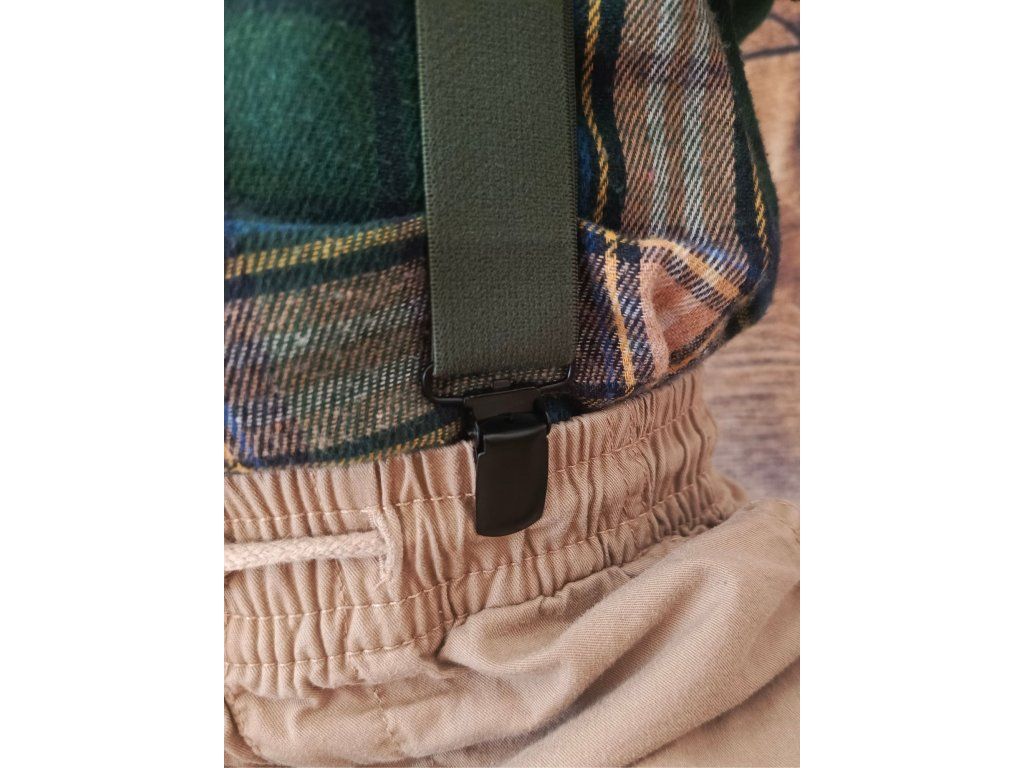 Traky: majú nastaviteľné gumy zelenej farby v kombinácii s čiernymi klipmi a hlavou jeleňa. Minimálna dĺžka trakov je 38cm a maximálna 65cm.