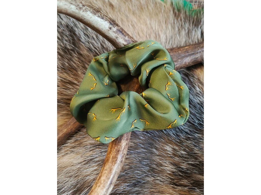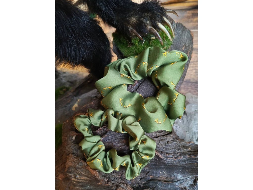 Saténová gumička scrunchie Antlers je vyrobená z extra lesklého saténu s autorskou potlačou parohov.