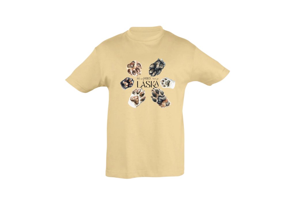 Detské tričko -  farba sand, predpraná 100% bavlna , dvojitý rebrovaný golier s elastanom, dvojité prešitie na golieri, ako aj na rukávoch a páse, zosilňujúca páska pri krku