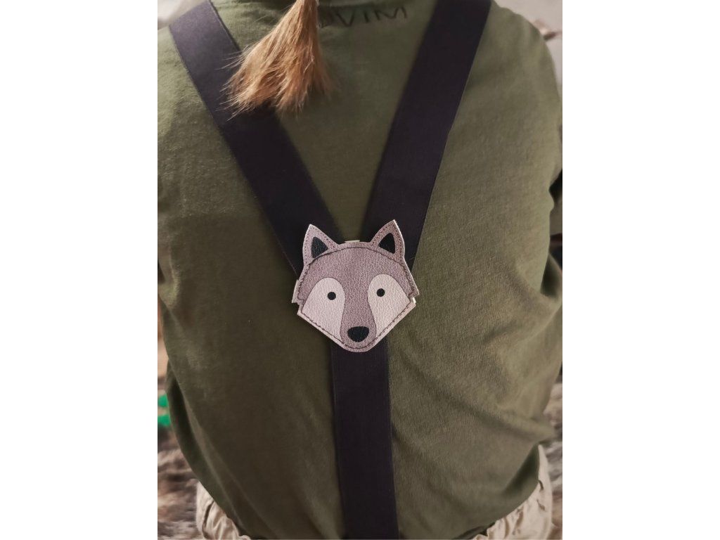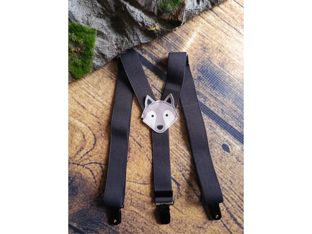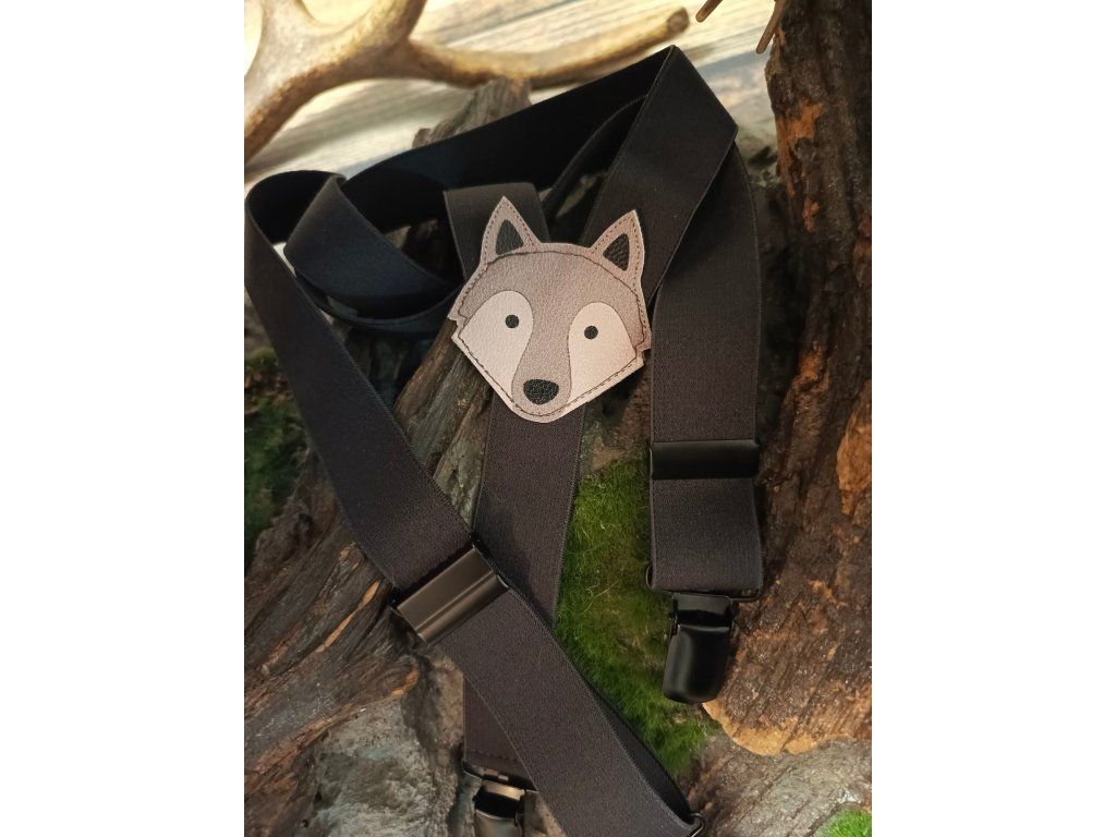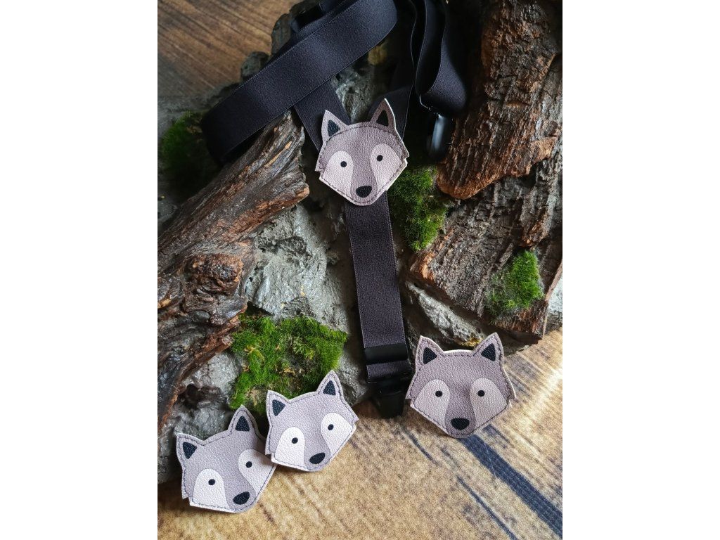 Traky: majú nastaviteľné gumy antracitovej farby v kombinácii s čiernymi klipmi a hlavou vlka. Minimálna dĺžka trakov je 38cm a maximálna 65cm.